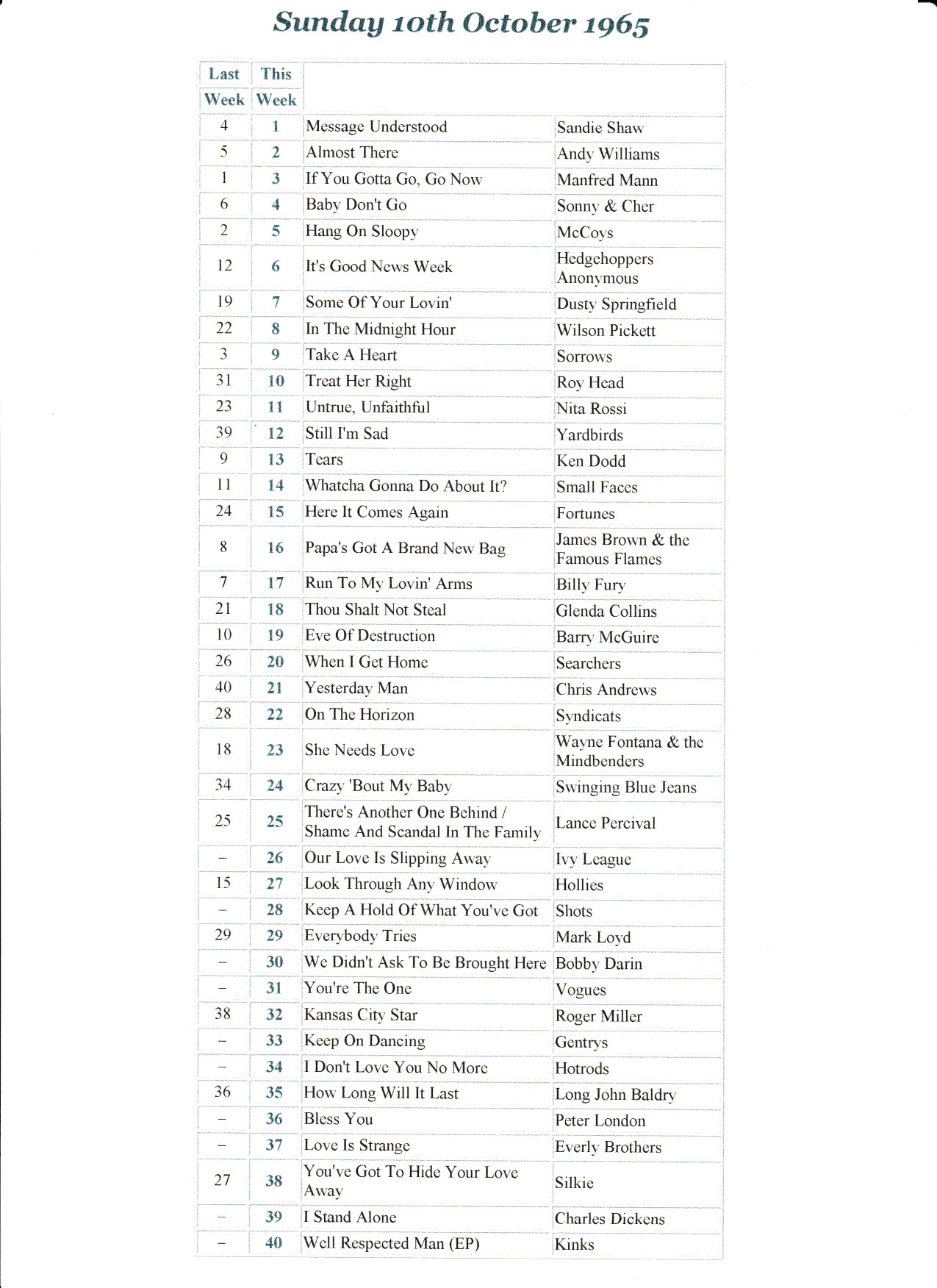 Op nummer 1: Sandie Shaw, verrassend maar erg leuk. Natuurlijk geschreven door Chris Andrews, die zelf op nummer 21 staan.