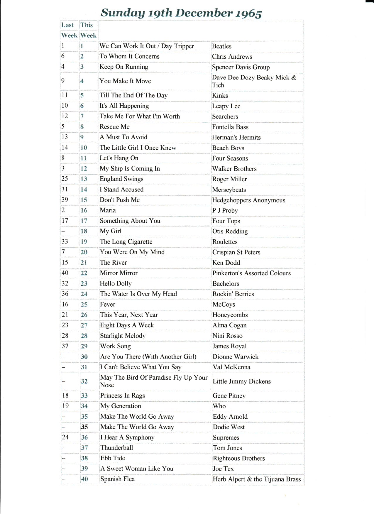 Op zondag tussen 13 en 15 uur hoor je de Radio London Fab40 van 19 december 1965 via 192Radio.