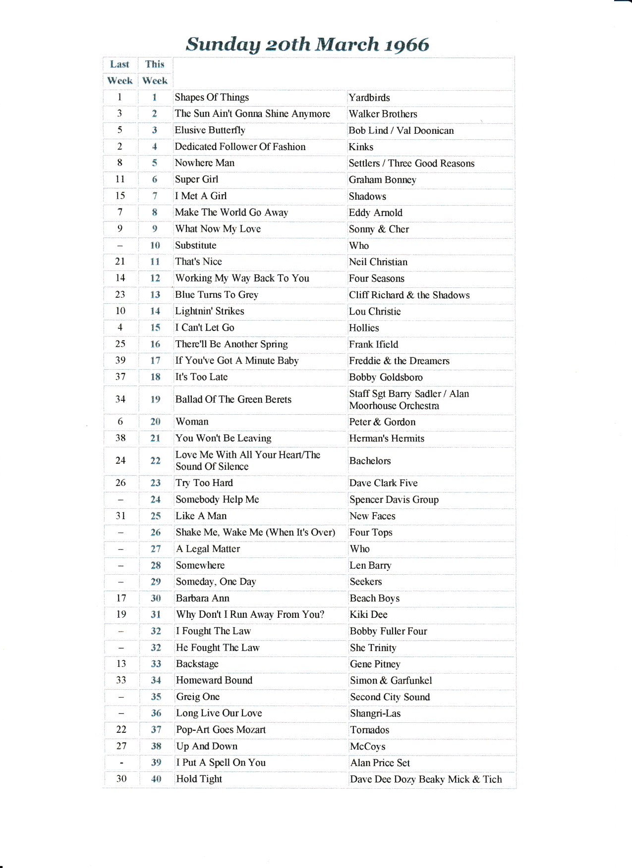 Zin in lekkere 60-ies op zondagmiddag tussen 13 en 15 uur? Dan kun je luisteren naar de Radio London Fab40. Bij 192Radio, met de lijst van 20 maart 1966 .