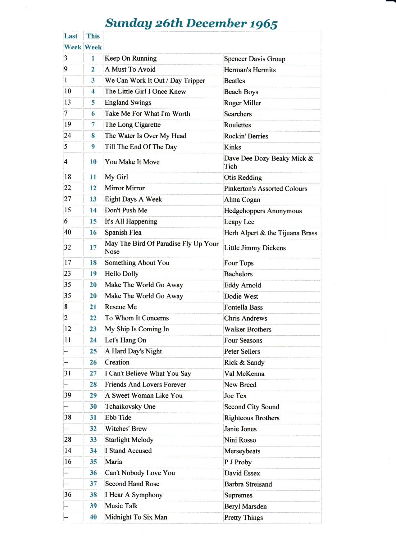 Op zondag tussen 13 en 15 uur hoor je de Radio London Fab40 van 26 december 1965 via 192Radio.